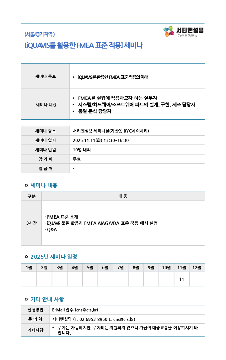 | 2025.11.11(È) 13:30 ~ 16:30 | iQUAVIS¸¦ Ȱ¿ëÇÑ FMEA Ç¥ÁØ Àû¿ë ¼¼¹Ì³ª |