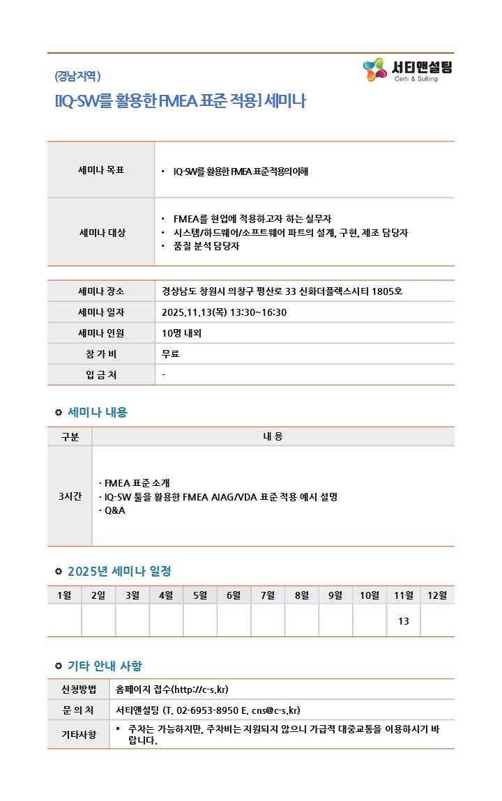 | 2025.11.13(¸ñ) 13:30 ~ 16:30 | IQ-SW¸¦ Ȱ¿ëÇÑ FMEA Ç¥ÁØ Àû¿ë ¼¼¹Ì³ª |